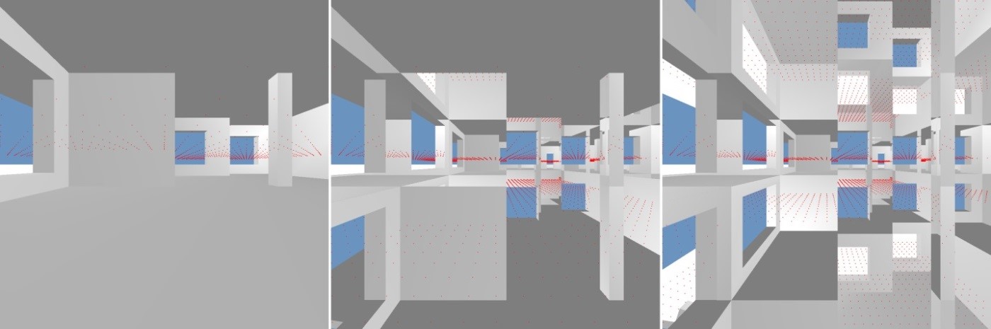 FIG: Radio signal reflections and refractions are recursively traversed using graphic primitives. The illustration shows three snapshots of a framebuffer object at increasing tree depth with black-and-white rendering of scene objects and visible reception points superimposed as red dots.